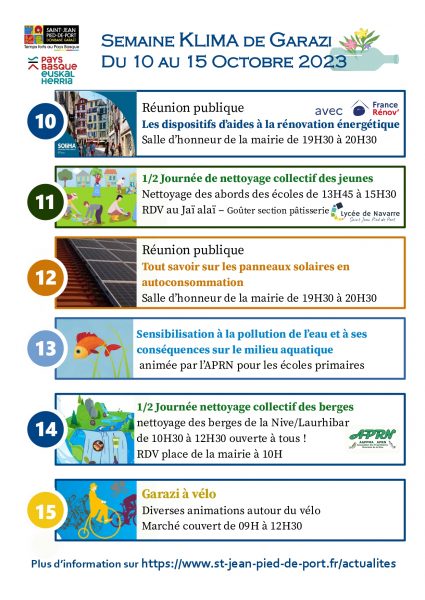 Dans cette optique, la commune de Saint Jean Pied de Port et le comité de pilotage de l’agenda 30 organisent La semaine Klima de Garazi et s’engagent autour de six manifestations.